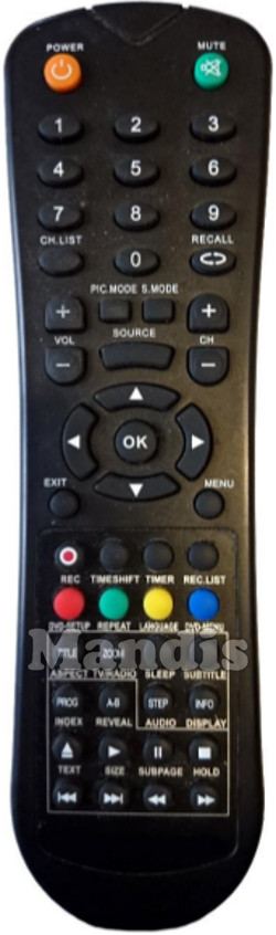 Power, Mute, 1, 2, 3, 4, 5, 6, 7, 8, 9, 0, CH.List, Recall, Pic Mode, S.Mode, Vol+, Vol-, CH+, CH-, Source, Exit, Menu, OK, Up, Down, Right, Left, Rec, Timeshift, Timer, Rec List, Red/DVD Setup, Green/Repeat, Yellow/Language, Blue/DVD Menu, Title/Aspect, Zoom/Tv/Radio, Sleep, Subtitle, Prog/Index, A-B/Reveal, Step/Audio, Info/Display, Eject/Text, Play/Size, Pause/Subpage, Stop/Hold, I<<, >>I, <<, >>