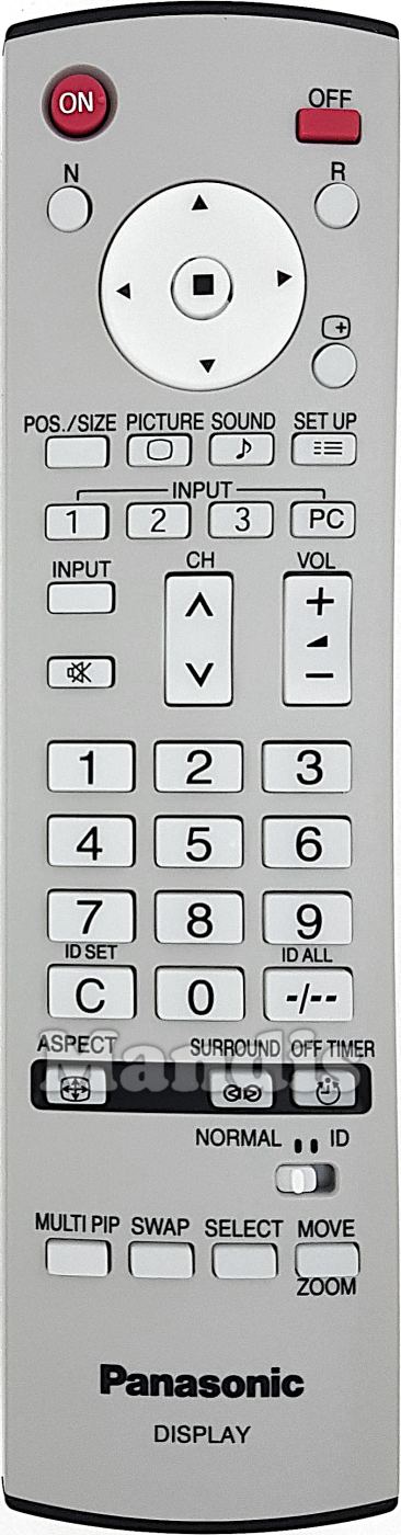 ON, OFF, N, R, Up, Left, Enter, Right, Down, [ +], Pos. / Size, Picture, Sound, Set Up, Input 1, Input 2, Input 3, Input PC, Input, Mute, CH+, CH-, Vol+, Vol-, 1, 2, 3, 4, 5, 6, 7, 8, 9, 0, C / ID SET, -/-- / ID ALL, Aspect, Surround, Off Timer, Multi PIP, Swap, Select, Move Zoom