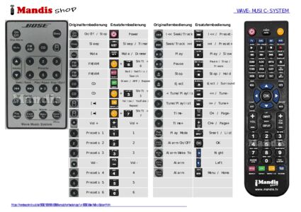 Diese Fernbedienung ersetzt Ihre Wave Music System in vollem Umfang und bietet alle Funktionen des Originals.