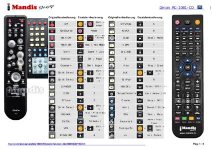 Diese Fernbedienung erfüllt alle Funktionen der Originalfernbedienung: On / Source, Off, Shift, Channel-, Channel+, Quick Select 1, Quick Select 2, Quick Select 3, DVD/HDP, TV/CBL, VCR, Play, Stop, Skip+ / Favorite / Rev. Play, Pause / A/B, <<, >>, >>I / CH+, I<< / CH-, Vol+, Vol-, Muting, V.Select / Setup, Night / Audio, Up, Left, CH Sel / Enter, Right, Down, Dimmer / Menu/Guide, Display, Status / Return, Zone 2 Off, Zone 2 On, Main Off, Main On, 1 / PHONO, 2 / CD, 3 / TUNER, 4 / DVD/HDP, 5 / TV/CBL, 6 / VCR, 7 / DVR, 8 / V.AUX, 9, 0 / iPod, AUX, +10/DTU, Tuning+ / TV Vol+, Tuning- / TV Vol-, Mode / DVD Menu, Band / Pic Adjust, Memory / Subtitle, Cinema, Music, STD, D/ST, Pure, Simu, A.Menu / Setup, Input / Audio, Test / Display, Return, Up, Left, Ent, Right, Down