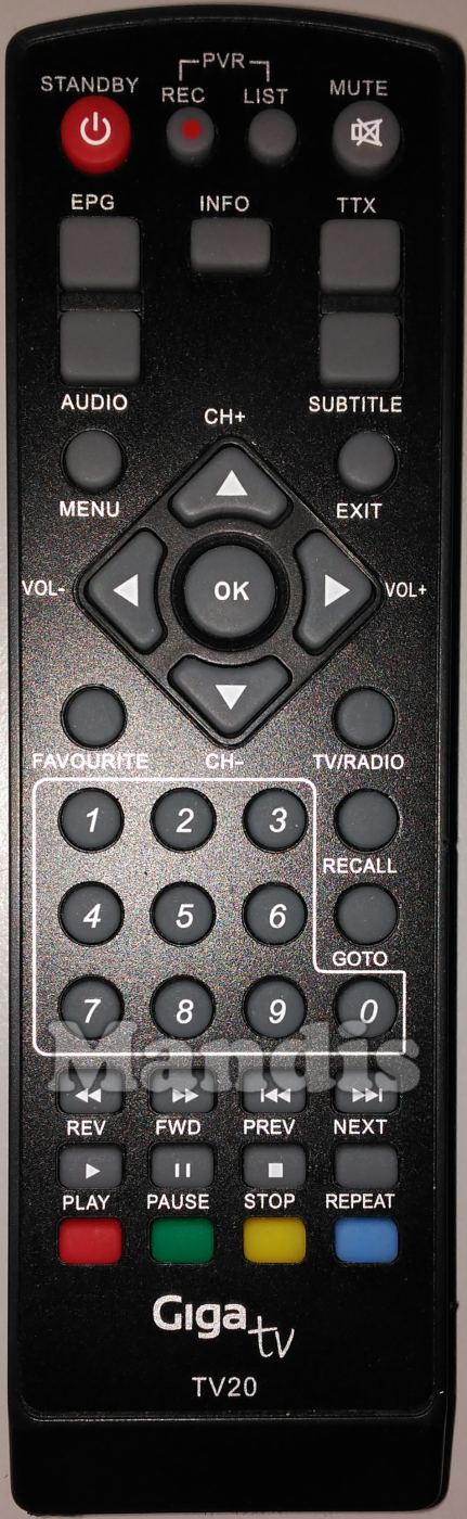 Fernbedienung Original TV20 zur Steuerung der Digitalfernsehen und SAT der Marke Giga Tv. Es handelt sich um eine Originalfernbedienung.
