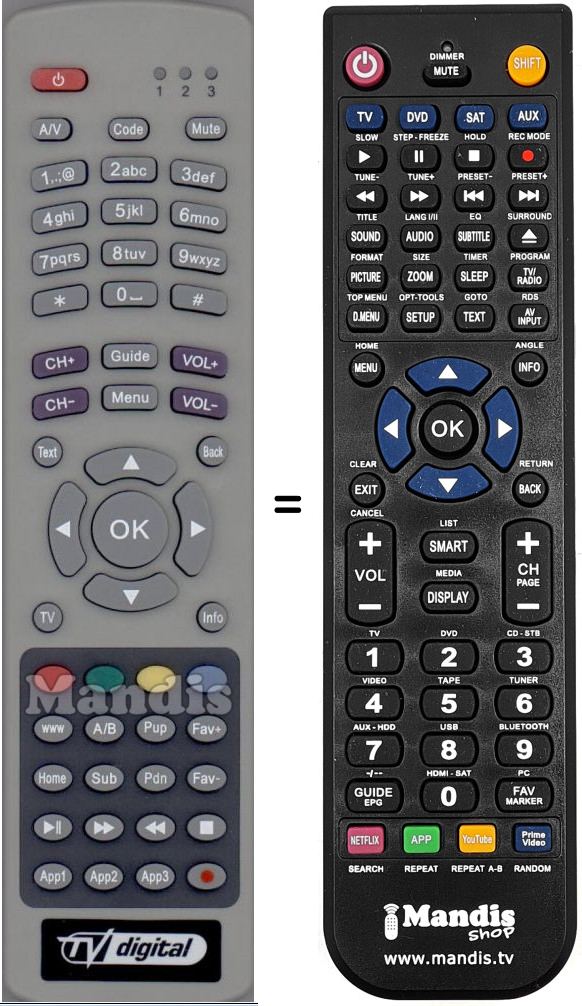 Die Fernbedienung ersetzt das Original RCU 018 in der Gesamtheit seiner Funktionen.