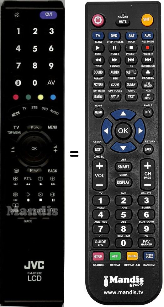 Die Fernbedienung ersetzt das Original RMC1932 (RMC19321C) in der Gesamtheit seiner Funktionen.