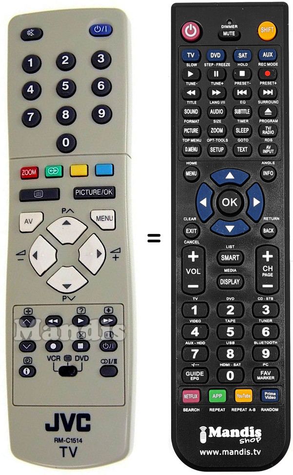 Die Fernbedienung ersetzt das Original RM-C1514 (BE5F2602W001) in der Gesamtheit seiner Funktionen.