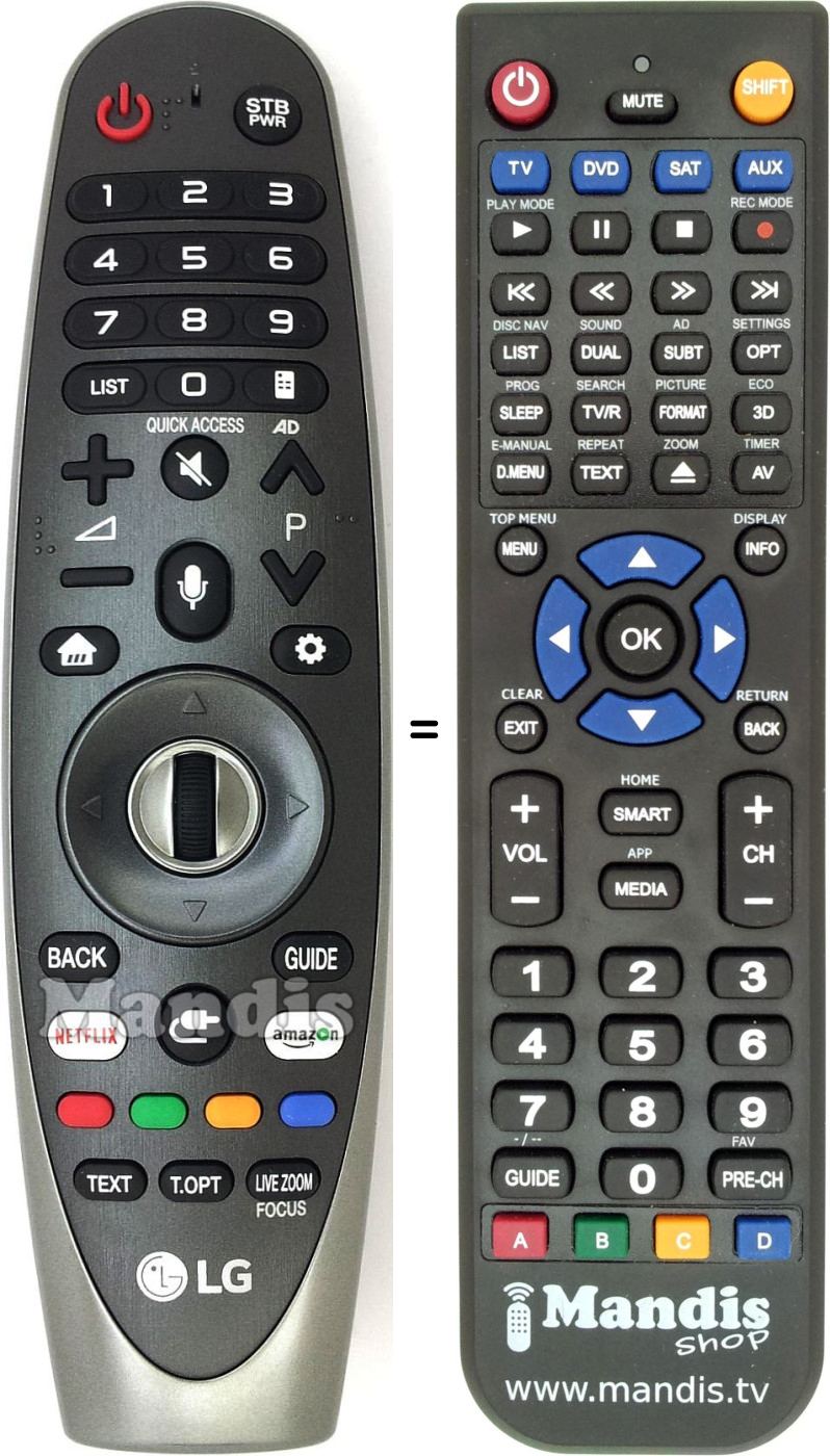 Im Folgenden zeigen wir Ihnen die Zuordnung jedes einzelnen Knopfes der Originalfernbedienung zu der Taste, die dieselbe Funktion auf der Ersatzfernbedienung ausführt. In einigen Fällen müssen Sie möglicherweise die UMSCHALT-Taste drücken, bevor Sie eine andere Taste drücken, um bestimmte Aktionen auszuführen. Diese zusätzlichen Funktionen werden oft wenig genutzt und dienen dazu, das Verständnis der Ersatzfernbedienung zu erleichtern oder weil die Originalfernbedienung mehr Tasten hat als das entsprechende Modell.