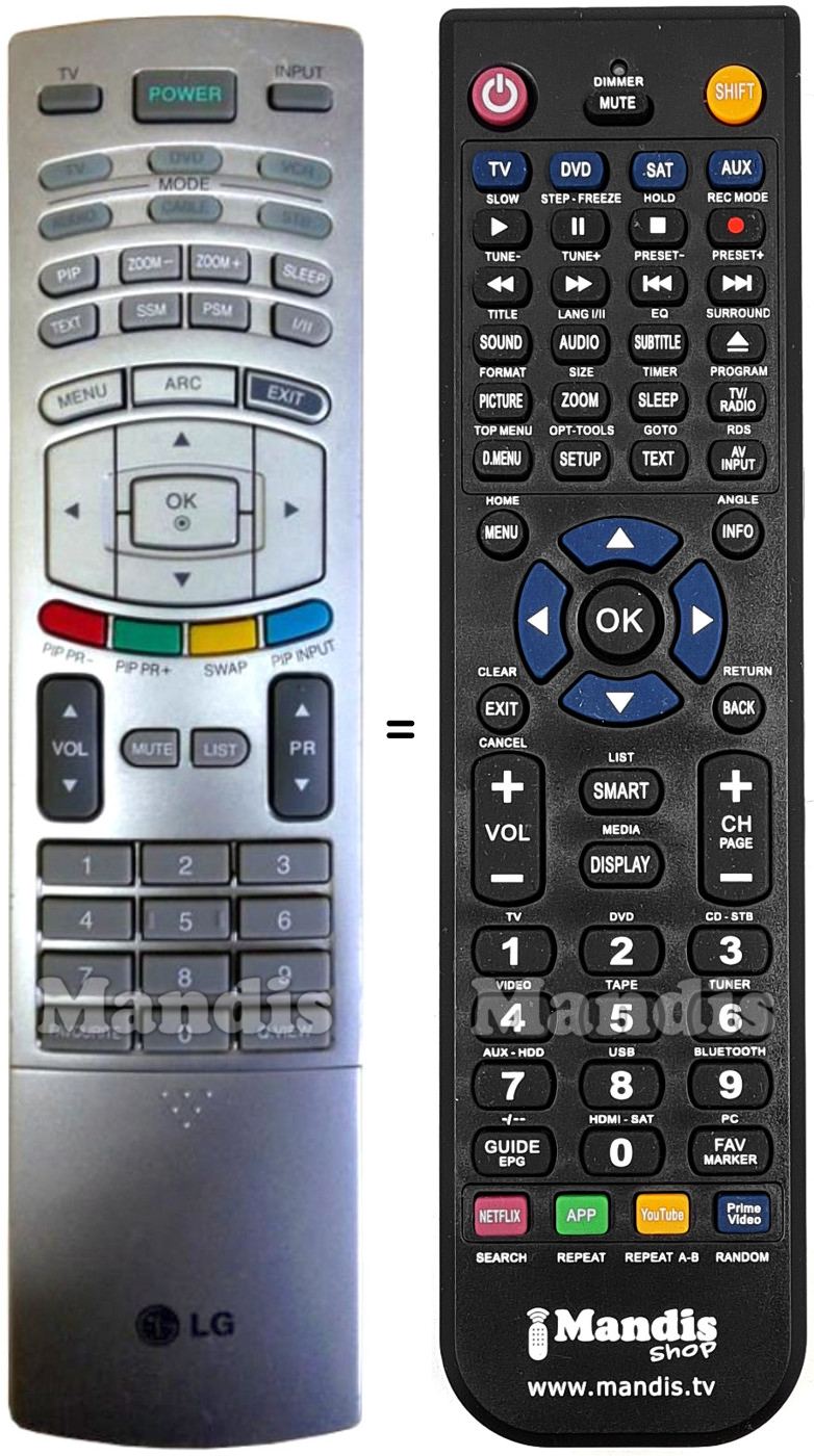Diese Fernbedienung erfüllt alle Funktionen der Originalfernbedienung: Power, TV, Input, PIP, Zoom -, Zoom +, Sleep, Text, SSM, PSM, I / II, Menu, ARC, Exit, Up, Right, Down, Left, OK, Red / PIP PR -, Green / PIP PR +, Yellow / Swap, Blue / PIP Input, Vol +, Vol -, Mute, List, PR +, PR -, 1, 2, 3, 4, 5, 6, 7, 8, 9, 0, Favourite, Q.View, Size, Position, Index, Hold, Time, Reveal, Mix, Mode, Play, Pause, Stop, Rec, <<, >>, I<<, >>I
