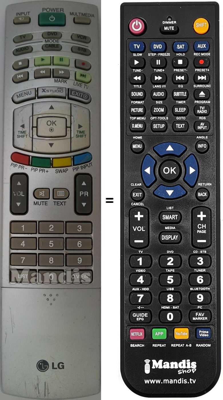Die Fernbedienung ersetzt das Original AKB30588001 in der Gesamtheit seiner Funktionen. Es handelt sich jedoch nicht um eine Universalfernbedienung sondern um eine Fernbedienung die das Original ersetzt. Sie erhalten eine nach Einlegen der Batterien sofort einsatzbereite Fernbedienung. Jegliches Programmieren entfällt. Wir geben umfassende Garantie dafür, dass diese Fernbedienung alle Funktionen der Originalfernbedienung erfüllt.