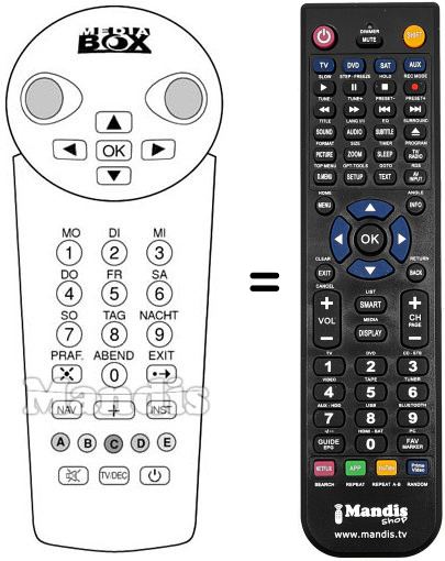 Fernbedienung, die das Original und die Gesamtheit seiner Funktionen, vollständig ersetzt. Es handelt sich jedoch nicht um eine Universalfernbedienung sondern um eine Fernbedienung die das Original ersetzt. Sie erhalten eine nach Einlegen der Batterien sofort einsatzbereite Fernbedienung. Jegliches Programmieren entfällt. Wir geben umfassende Garantie dafür, dass diese Fernbedienung alle Funktionen der Originalfernbedienung erfüllt.