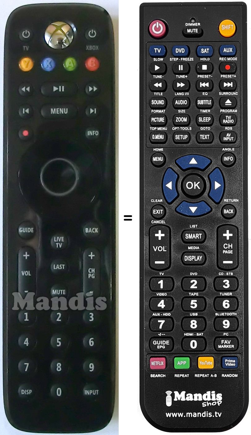 Im Folgenden zeigen wir Ihnen die Zuordnung jedes einzelnen Knopfes der Originalfernbedienung zu der Taste, die dieselbe Funktion auf der Ersatzfernbedienung ausführt. In einigen Fällen müssen Sie möglicherweise die UMSCHALT-Taste drücken, bevor Sie eine andere Taste drücken, um bestimmte Aktionen auszuführen. Diese zusätzlichen Funktionen werden oft wenig genutzt und dienen dazu, das Verständnis der Ersatzfernbedienung zu erleichtern oder weil die Originalfernbedienung mehr Tasten hat als das entsprechende Modell.