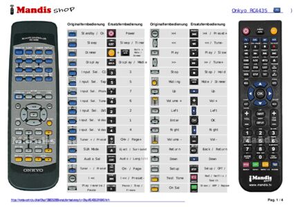 Diese Fernbedienung erfüllt alle Funktionen der Originalfernbedienung: Standby / On, Sleep, Dimmer, Display, CD, Input Tape, Slector Phono, Tuner, DVD, Video 1, Video 2, SUR. Mode, SW Mode, Audio Sel, Tuner + / Preset +, Tuner - / Preset -, Mode Standby / On, Mode DVD, Mode CD, Mode Tape, I<<, >>I, Play Reverse / Pause, <<, Play, >>, Stop, Disc, Muting, Top Menu, Menu, Up, Right, Down, Left, Enter, Volume +, Volume -, Return, Setup, Test Tone, CH Sel, Level -, Level +