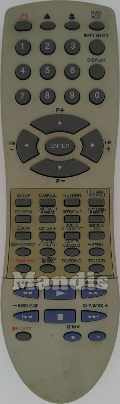 Power, Open/Close VCR, Open/Close DVD, DVD/VCR, 1, 2, 3, Input Select, 4, 5, Display, 6, 7, 8, 9, 0, P+/UP, TRK-/Left, TRK+/Right, P-/Down, Enter, Setup, Cancel, Return, Title Menu/Top Menu, Dvd Menu, One Touch Repeat, Repeat A-B, Play Mode/Repeat, Zoom, CM Skip, Audio/ Audio Select, Subtitle /ATR, Progressive, Clock/Counter, Angle / 00:00:00, ∟Zero, Timer Rec, Rec Mode/Speed, Dubbing, TV/VCR, <<, Play, >>, I<<Skip/Index -, Stop, >>I Skip/Index +, Rec /OTR, Pause II/►◄, I>