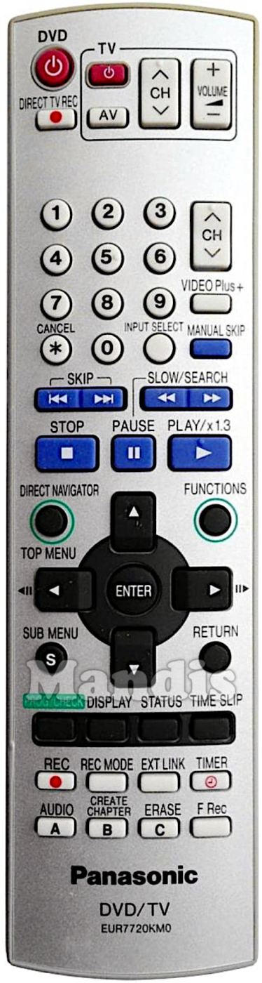 Power DVD, Direct TV Rec, TV Power, TV AV, TV CH+, TV CH-, TV Volume+, TV Volume-, 1, 2, 3, 4, 5, 6, 7, 8, 9, 0, Cancel, Input Select, CH+, CH-, VIDEO Plus+, Manual Skip, I<<, >>I, <<, >>, Stop, Pause, Play / x1.3, Direct Navigator / Top Menu, Functions, Up, Left, Enter, Right, Down, Sub Menu, Return, Prog / Check, Display, Status, Time Slip, Rec, Rec Mode, Ext Link, Timer, A / Audio, B / Create Chapter, C / Erase, F.Rec