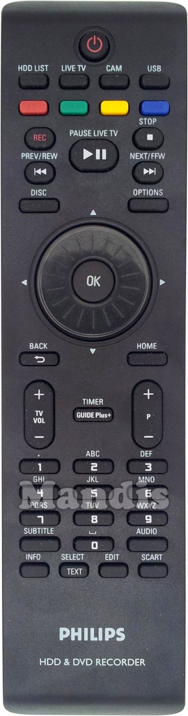Power, HDD List, Live TV, CAM, USB, Red, Green, Yellow, Blue, Rec, Play / Pause / Pause Live TV, Stop, I<< / Prev / Rew, >>I / Next / FFW, Disc, Options, Up, Down, Right, Left, OK, Home, aaaTV Vol +, TV Vol -, cGuide Plus+ / Timer, P +, kP -, 1, 2, 3, 4, 5, 6, 7, 8, 9, 0, Subtitle, Audio, Info, Back, Edit, Scart, Text/Select