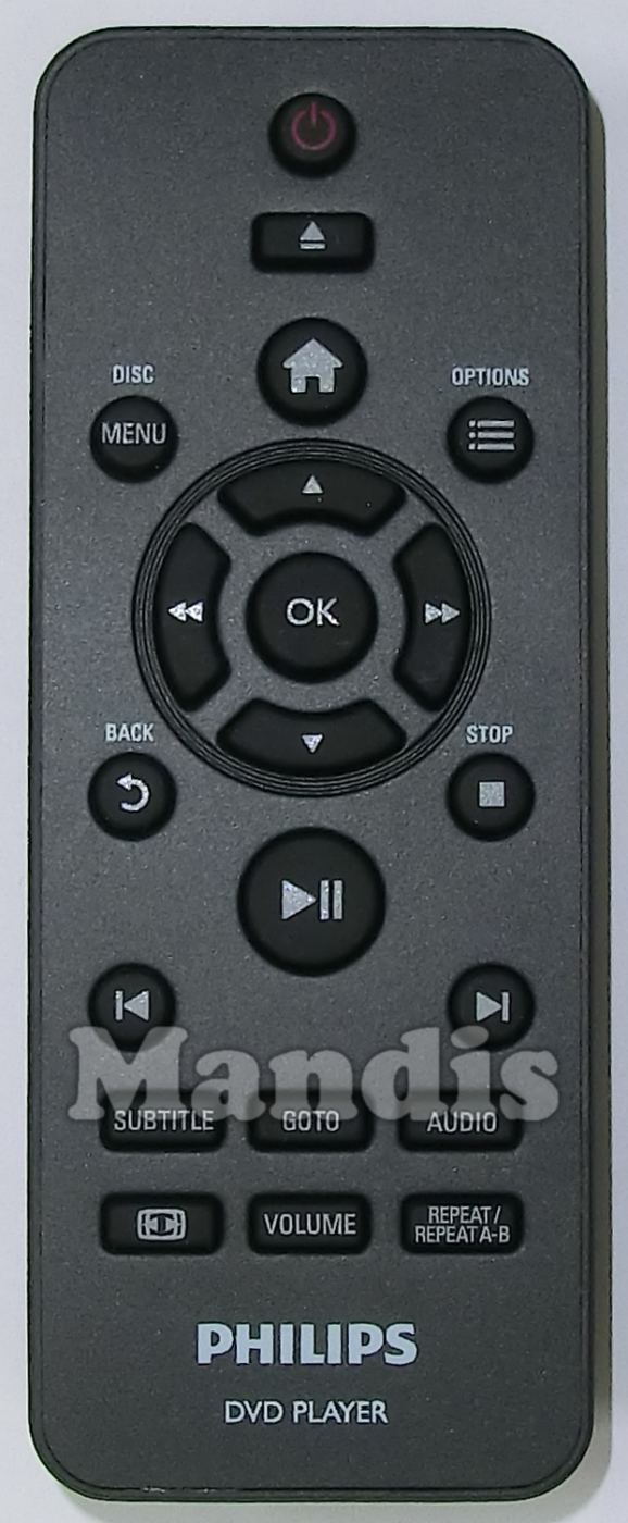 Power, Open/Close, Home, Menu/Disc, Options, OK, Up, Down, <<, >>, Back, Stop, Play/Pause, I<, >I, Subtitle, Goto, Audio, [<>], Volume, Repeat/Repeat A-B