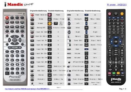 Diese Fernbedienung erfüllt alle Funktionen der Originalfernbedienung: Power Receiver, Sleep, Dimmer, Analog ATT, DVD / DVD 5.1, TV, DVR, Receiver, CD, CD-R, FM, AM, Standard, Adv. Surr, Stereo, Midnight / Loudness, Top Menu / Setup, Menu / Dialog E, Up, Left, Enter, Right, Down, Tuner Edit / S.Retriever, One Touch Copy / Return, Volume-, Volume+, Effect / CH. Sel, Level-, Level+, Mute, DVD/DVR Power, CH- / HDD, CH+ / DVD, Subtitle, << / Guide, Play / Rec, >>, Audio, I<< / Timer Rec, Pause / Info, Stop / Rec Stop, >>I / Jukebox, Display, Class, MPX, Tuning+, Tuning-, Station+, Station-, Shift