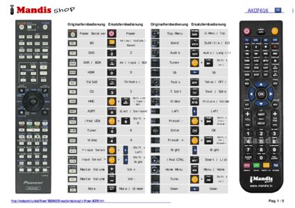 Diese Fernbedienung erfüllt alle Funktionen der Originalfernbedienung: Power Receiver, Multi Operation / RCU Setup, Power Source, BD, DVD, DVR / BDR, HDMI, TV / SAT, CD, HMG, ADPT, iPod / USB, TUNER, VIDEO, TV CTRL, ↶ Input Select, Input Select ↷, Zone 2, Receiver, TV Power, TV Input, TV CH+, TV CH-, TV Vol+, TV Vol-, Master Volume+, Master Volume-, Mute, Audio Parameter / List / Band / Top Menu, Video Parameter / Tools / T.Edit / Guide, Up / Tune+, Down / Tune-, Right / Preset+, Left / Preset-, Enter, Home Menu / PTY Search / iPod CTRL, Return, HDD / Red, DVD / PGM / Green, Repeat / Yellos, Random / Menu / Blue, <<, Phase CTRL / Play, Status / >>, TV/DTV / I<<, MPX / Pause, PQLS / Stop, >>I, 1 / S.Retreiver, 2, 3, 4 / Signal Sel, 5 / MCACC, 6 / Sleep, 7 / CH Level, 8 / A.Att, 9 / Dimmer, 0, Rec / CLR / D.Access, Enter / Class, Audio, Disp / Info, CH+, CH-, Auto / Alc / Direct, Stereo, Standard, Adv Surr
