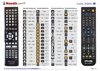 Diese Fernbedienung erfüllt alle Funktionen der Originalfernbedienung: Receiver Power, Sleep, Source Power, Receiver, Input Select-, Input Select+, Network, iPod/USB, Adapter, BD, DVD, DVR/BDR, SAT/CBL, Game, Video, CD, TV, Tuner, TV Power, TV Input, TV CH+, TV CH-, TV Vol+, TV Vol-, Auto / DIrect, Alc / Standard, ADV Surr, +Favorite, Audio Parameter / Top Menu, Tools Menu, Home Menu / PTY / iPod CTRL, Return / Band, Up / Tune+, Down / Tuner-, Right / Preset+, Left / Preset-, Enter, Volume+, Volume-, Pause, Stop, Play, Mute, I<< / Bass-, >>I / Bass+, << / Tre-, >> / Tre+, EQ / 1, Phase / 2, Signal Sel / 3, S.Retriever / 4, SB CH / 5, CH Select / 6, Midnight / 7, Speakers / 8, Lev+ / 9, 0, Dimmer / CLR / +10, Lev- / Enter, Disp, CH+ / Repeat, CH- / Shuffle, Shift