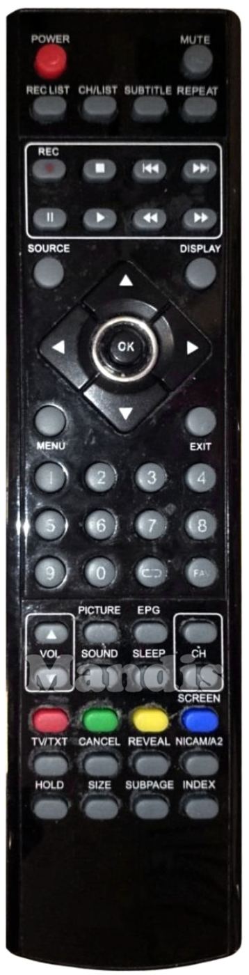Power, Mute, Rec List, CH / List, Subtitle, Repeat, Rec, Stop, I<<, >>I, Pause, Play, <<, >>, Source, Display, Up, Right, Down, Left, OK, Menu, Exit, 1, 2, 3, 4, 5, 6, 7, 8, 9, 0, Recall, FAV , Vol +, Vol -, Picture, Sound, EPG, Sleep, CH +, CH -, Red, Green, Yellow, Blue / Screen, TV / Txt, Cancel, Reveal, Nicam / A2, Hold, Size, Subpage, Index