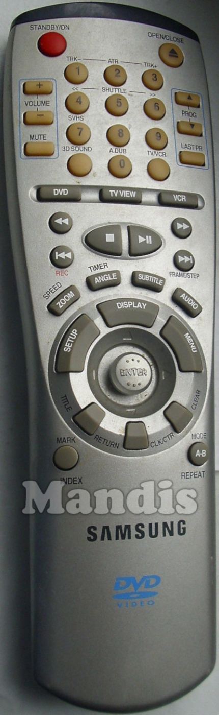 Standby / On, Open / Close, 1 / ATR TRK -, 2 / ATR, 3 / ATR TRK +, 4 / Shuttle <<, 5 / Shuttle, 6 / Shuttle >>, 7 / SVHS, 8, 9, 3D Sound, 0 / A.Dub, TV / VCR, Volume +, Volume -, Mute, Prog +, Prog -, Last Pr, DVD, TV View, VCR, <<, >>, Stop, Play / Pause, I<< / REC, >>I / Frame / Step, Zoom / Speed, Angle / Timer, Subtitle, Audio, Setup, Display, Menu, Up, Down, Right, Left, Enter, Title, Return / CLK/CTR, Clear, Mark / Index, A-B / Mode / Repeat