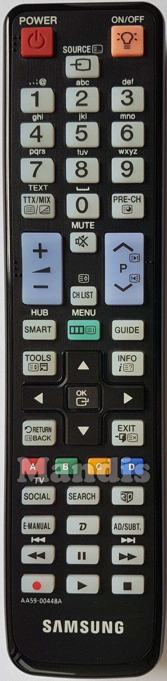 Power, Source, 1, 2, 3, 4, 5, 6, 7, 8, 9, 0, TTX/MIX, PRE-CH, Mute, CH List, Vol+, Vol-, P+, P-, Smart Hub, Menu, Guide, Tools, Info, Return/Back, Exit, OK, Up, Down, Right, Left, Red, Green, Yellow, Blue, Social Tv, Search, 3D, E-Manual, D, AD/Subt., <</I<<, Pause, >>/>>I, Rec, Play, Stop