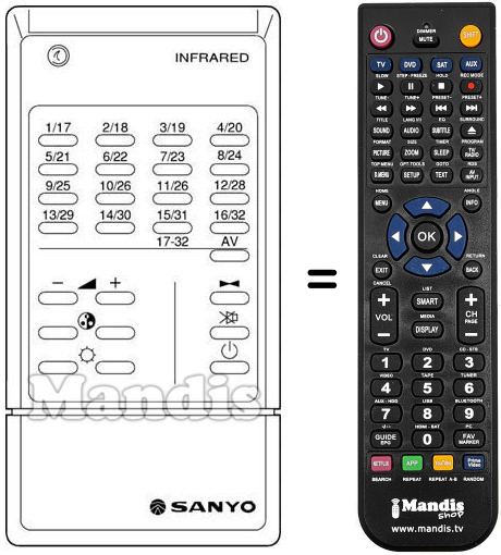 Fernbedienung, die das Original und die Gesamtheit seiner Funktionen, vollständig ersetzt. Es handelt sich jedoch nicht um eine Universalfernbedienung sondern um eine Fernbedienung die das Original ersetzt. Sie erhalten eine nach Einlegen der Batterien sofort einsatzbereite Fernbedienung. Jegliches Programmieren entfällt. Wir geben umfassende Garantie dafür, dass diese Fernbedienung alle Funktionen der Originalfernbedienung erfüllt.