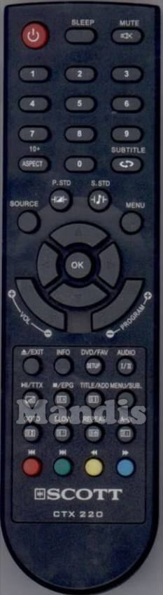 Fernbedienung Original CTX220 zur Steuerung der TV-Geräte der Marke Scott. Es handelt sich um eine Originalfernbedienung.