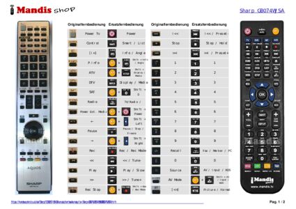 Diese Fernbedienung erfüllt alle Funktionen der Originalfernbedienung: TV Power, Control, i+, P.Info, ATV, DTV, SAT, Radio, Ext Media Power, Ext Media Rec, Ext Media Rec Stop, Ext Media <--, Ext Media Pause, Ext Media -->, Ext Media <<, Ext Media Play, Ext Media >>, Ext Media I<<, Ext Media Stop, Ext Media >>I, 1, 2, 3, 4, 5, 6, 7, 8, 9, 0, Recall, Source, AV Mode, Format, APP, ECO, I / II / I+II, Text, Vol +, Vol -, P +, P -, Mute, Menu, Home, 3D, EPG, Up, Right, Down, Left, OK, END, Back, Subtitles, [=?], [=o], [= ], Red, Green, Yellow, Blue