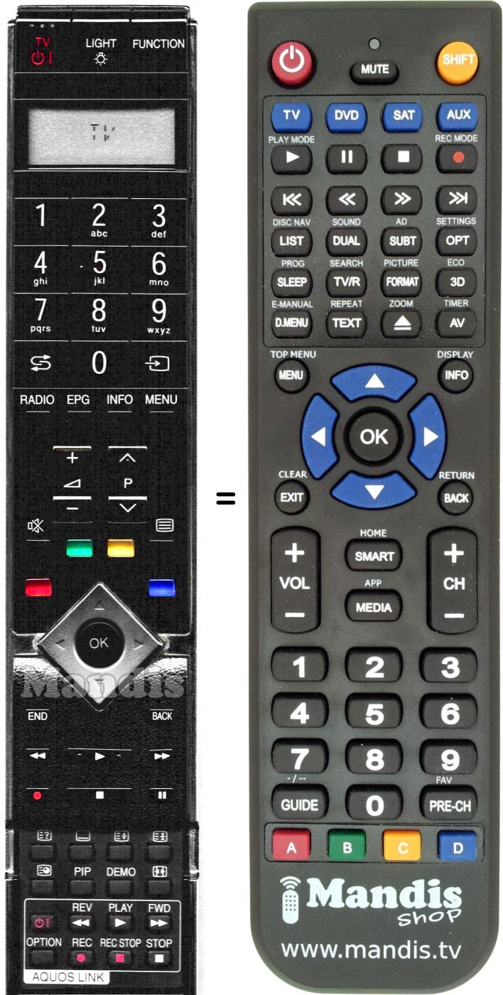 Diese Fernbedienung ersetzt die meisten Funktionen Ihres RRMCGA555WJSA. Es ist keine Universalfernbedienung, sondern eine Kopie mit den meisten Tasten und Funktionen Ihres Originals.