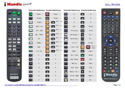 Diese Fernbedienung erfüllt alle Funktionen der Originalfernbedienung: System Standby, AV Standby, Sleep, VIDEO, DVD/LD, TV/SAT, AD/TAPE, CD, TUNER, 1 / Menu, 2 / Up, 3, 4 / Left, 5 / Enter, 6 / Right, 7 / Title, 8 / Down, 9, 0, >10 / -/-- / Shift, Enter / D.Tuning / Return, I<< / Position, >>I / Swap, Disc+ / CH/Preset+, Disc- / CH/Preset-, << / Sub CH -, >> / Sub CH +, Play Rev. / Display, Play / P IN P, D.Skip / ANT / TV/VTE, Pause / Jump, Stop / Wide, TV / Video, A.F.D, 2CH / OFF, Mode, EQ / Tone, Bass Boost, Muting, Test Tone, Cursor Mode, Menu Left, Menu Right, Menu-, Menu+, Master Vol +, Master Vol -, 5.1 CH., AUX