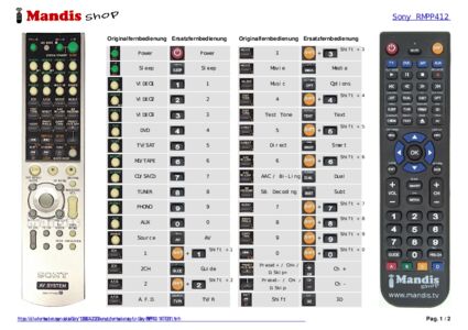 Diese Fernbedienung erfüllt alle Funktionen der Originalfernbedienung: System Standby / Sleep, AV Standby, TV Power, VIDEO1 / AV1, VIDEO2 / AV2, VIDEO3, DVD, TV/SAT, MD/TAPE, CD/SACD, TUNER, PHONO, AUX, Multi CH, Source, 2CH / 1, A.F.D. / 2, Movie / 3, Test Tone / 4, Direct / 5, AAC / Bi-Link / 6, Audio / 7, Swap / Angle / 8, Jump / Time / 9, Music, SB Decoding, Preset+ / CH+ / D.Skip+, Preset- / CH- / D.Skip-, I<< / 0/10, >>I / Subtitle / >10/11, Enter / 12, << / Shift / ANT, >> / D.Tuning / Clear, -/-- / Disc / Search Mode, ALT, Play, Pause, Stop, Top Menu / Guide, AV Menu, Muting, Master Vol +, Master Vol -, Up, Left, Enter, Right, Down, Display, Return / Exit, TV Vol +, TV Vol -, TV CH +, TV CH -, TV / Video, Wide, Main Menu, On Screen