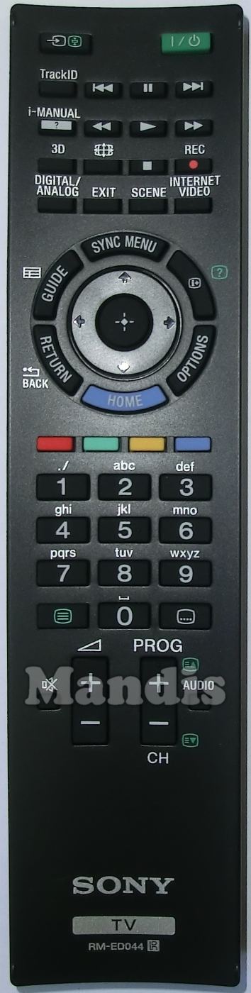 Power, Source, TrackID, I<<, Pause, >>I, ?/i-Manual, <<, Play, >>, 3D, [+], Stop, Rec, Digital/Analog, Exit, Scene, Internet Video, Sync Menu, Home, Guide, [i+]/[?], Return/Back, Options, OK, Up, Down, Right, Left, Red, Green, Yellow, Blue, 1, 2, 3, 4, 5, 6, 7, 8, 9, [=], 0, [...], Vol+, Vol-, Prog/CH+, Prog/CH-, Mute, Audio
