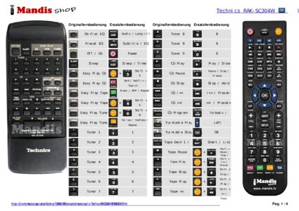 Diese Fernbedienung erfüllt alle Funktionen der Originalfernbedienung: Off / On, Sleep, Easy Play CD, Easy Play Tape, Easy Play Tuner, Tuner 1, Tuner 2, Tuner 3, Tuner 4, Tuner 5, Tuner 6, Tuner 7, Tuner 8, Tuner 9, Tuner 0, CD Play, CD Pause, CD Stop, CD I<<, CD >>I, CD Program, CD Time Mode, EQ On/Flat, EQ Preset, Turntable Play Reverse, Turntable Stop, Tape Deck 1/2, Tape Pause, Tape Deck 2 Rec Stop / Auto Rec Mute, Tape Deck 2 Rec, Tape Play Reverse, Tape Stop, Tape Play, Tape <<, Tape >>, Muting -20dB, Volume -, Volume +