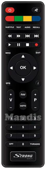 Power, Mute, Red, Green, Yellow, Blue, Subtitle, Text, Audio, Recall, <<, >>, I<<, >>I, Play, Pause, Stop, Rec, Menu, Exit, Up, Left, OK, Right, Down, EPG, i, V+, V-, Fav, Goto, P+, P-, 1, 2, 3, 4, 5, 6, 7, 8, 9, 0, OPT, TV/Radio