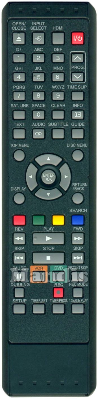 Power, Open / Close, Input Select, HDMI, 1, 2, 3, 4, 5, 6, 7, 8, 9, 0, Prog +, Prog -, Time Slip, Sat. Link, Clear, Info, Text, Audio, Subtitle, Guide, Top Menu, Disc Menu, Display, Return / Back, Up, Down, Right, Left, Enter / Ok, Red, Green, Yellow, Blue / Search, <<, Play, >>, I<<, Stop, >>I, Pause, VCR, DVD, Instant Skip, Dubbing, Rec, Rec Mode, Setup, Timer Set, Timer Prog, 1.3x/0.8x Play
