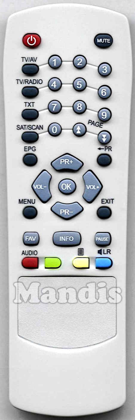 Power, Mute, TV/AV, TV / Radio, TXT, SAT / Scan, EPG, 1, 2, 3, 4, 5, 6, 7, 8, 9, 0, Page+, Page-, ←PR, Up / PR+, Down / PR-, Right / Vol+, Left / Vol-, OK, Menu, Exit, FAV, Info, Pause, Red / Audio, Green, Yellow / ≡, Blue / LR