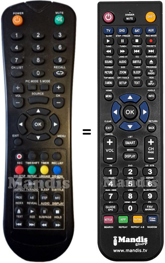 Below, we will show you the correspondence between each button on the original remote control and the button that performs the same function on the replacement remote control. In some cases, you may need to press the SHIFT key before pressing another button to perform certain actions. These additional functions are often not widely used and are included to facilitate understanding of the replacement remote control, or because the original remote control has more buttons than its equivalent.