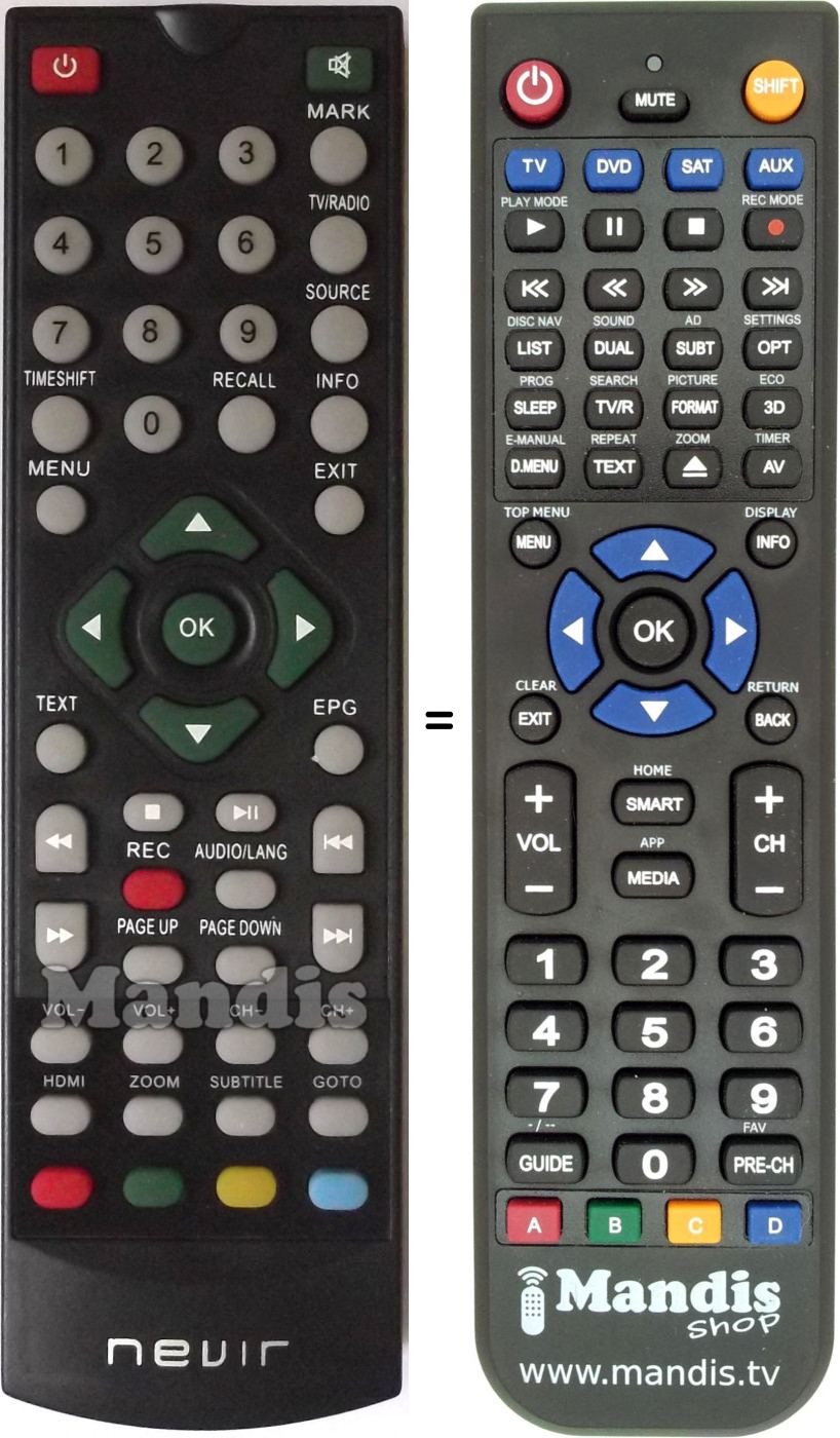 This remote control fully replaces your Nevir003 and offers all the functions of the original.