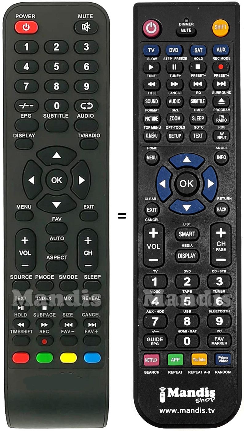 Below, we will show you the correspondence between each button on the original remote control and the button that performs the same function on the replacement remote control. In some cases, you may need to press the SHIFT key before pressing another button to perform certain actions. These additional functions are often not widely used and are included to facilitate understanding of the replacement remote control, or because the original remote control has more buttons than its equivalent.