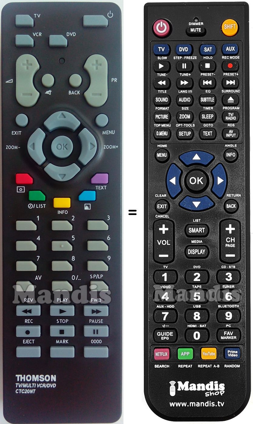 Below, we will show you the correspondence between each button on the original remote control and the button that performs the same function on the replacement remote control. In some cases, you may need to press the SHIFT key before pressing another button to perform certain actions. These additional functions are often not widely used and are included to facilitate understanding of the replacement remote control, or because the original remote control has more buttons than its equivalent.