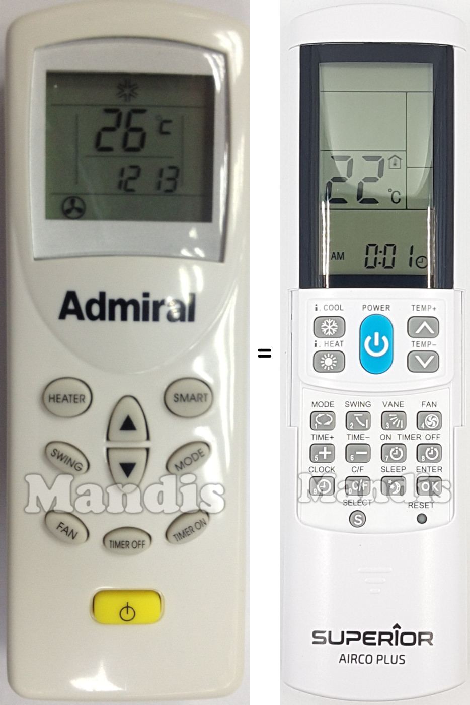 My LG air-conditioner's remote died and need replacement. AircoPlus did the job. I should point out that the code match did not correspond according to manufacturer's table. Let the auto-search code set up do the work. Also, excellent service by Mandis Remotes with a well-protected package.