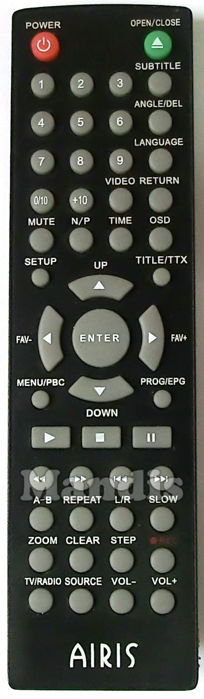 Power, Open / Close, Subtitle, Angle / Del, Language, 1, 2, 3, 4, 5, 6, 7, 8, 9, 0 / 10, +10, Video, Return, Mute, N / P, Time, OSD, Setup, Title / TTX, Up, Down, Right / Fav +, Left / Fav -, Enter, Menu / PBC, Prog / EPG, Play, Stop, Pause, <<, >>, I<<, >>I, > - B, Repeat, L / R, Slow, Zoom, Clear, Step, Rec, TV / Radio, Source, Vol -, Vol +