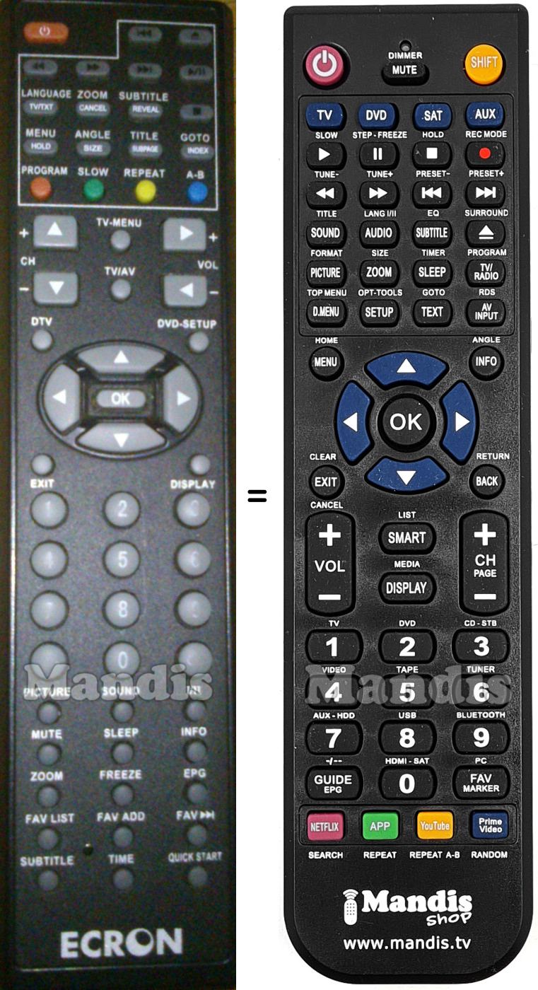 Below, we will show you the correspondence between each button on the original remote control and the button that performs the same function on the replacement remote control. In some cases, you may need to press the SHIFT key before pressing another button to perform certain actions. These additional functions are often not widely used and are included to facilitate understanding of the replacement remote control, or because the original remote control has more buttons than its equivalent.