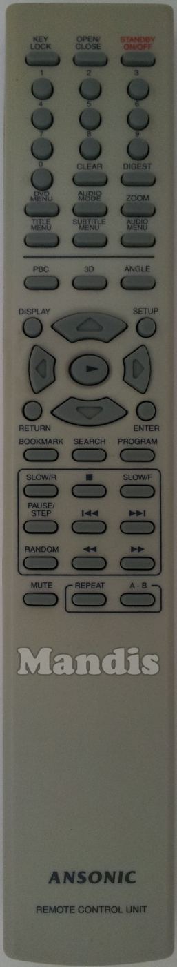 Key Lock, Open/Close, Standby On/Off, 1, 2, 3, 4, 5, 6, 7, 8, 9, 0, Clear, Digest, DVD Menu, Audio Mode, Zoom, Title Menu, Subtitle Menu, Audio Menu, PBC, 3D, Angle, Display, Setup, Enter, Return, Search, Program, Book/Mark, Slow/R, Stop, Slow/F, Pause/Step, Up, Down, Right, Left, Play, I<<, >>I, <<, >>, Random, Mute, Repeat, A-B