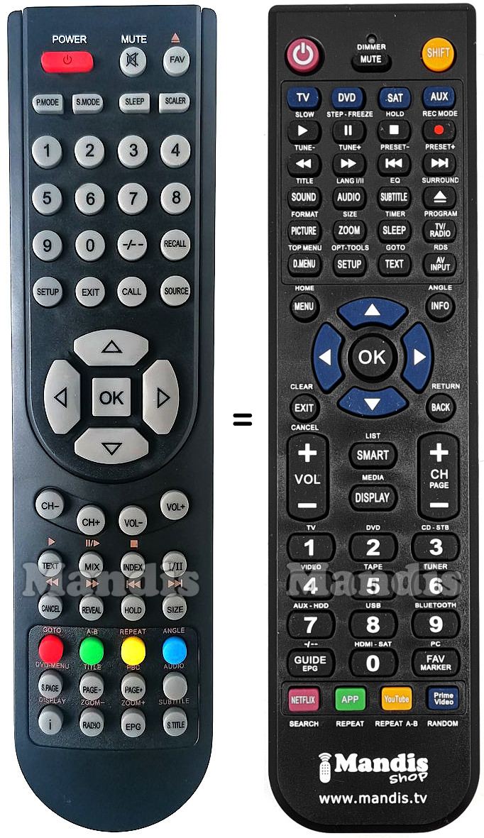 Below, we will show you the correspondence between each button on the original remote control and the button that performs the same function on the replacement remote control. In some cases, you may need to press the SHIFT key before pressing another button to perform certain actions. These additional functions are often not widely used and are included to facilitate understanding of the replacement remote control, or because the original remote control has more buttons than its equivalent.