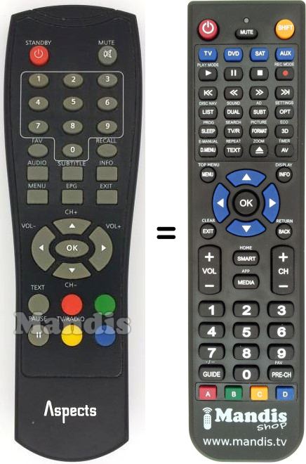 Below, we will show you the correspondence between each button on the original remote control and the button that performs the same function on the replacement remote control. In some cases, you may need to press the SHIFT key before pressing another button to perform certain actions. These additional functions are often not widely used and are included to facilitate understanding of the replacement remote control, or because the original remote control has more buttons than its equivalent.
