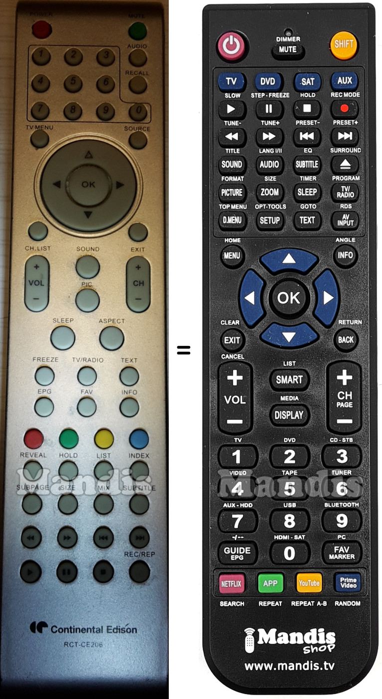 Below, we will show you the correspondence between each button on the original remote control and the button that performs the same function on the replacement remote control. In some cases, you may need to press the SHIFT key before pressing another button to perform certain actions. These additional functions are often not widely used and are included to facilitate understanding of the replacement remote control, or because the original remote control has more buttons than its equivalent.