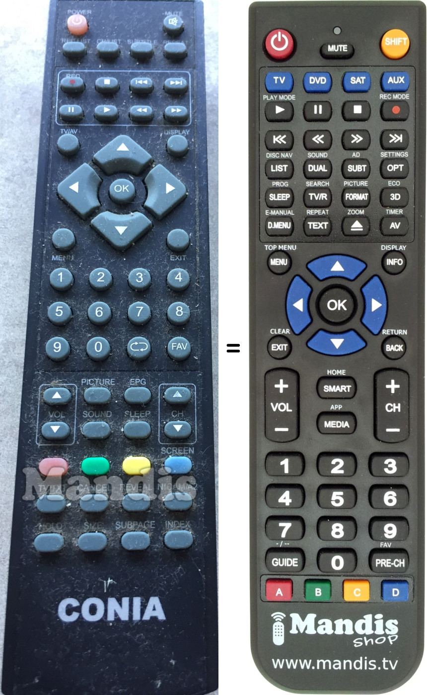 Below, we will show you the correspondence between each button on the original remote control and the button that performs the same function on the replacement remote control. In some cases, you may need to press the SHIFT key before pressing another button to perform certain actions. These additional functions are often not widely used and are included to facilitate understanding of the replacement remote control, or because the original remote control has more buttons than its equivalent.