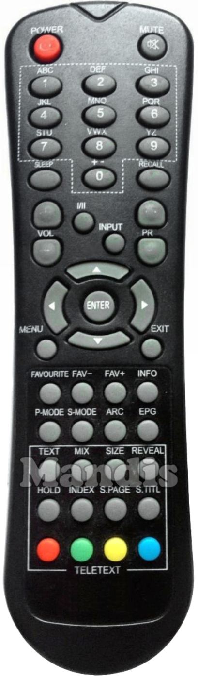 Power, Mute, 1, 2, 3, 4, 5, 6, 7, 8, 9, 0, Sleep, Recall, Vol+, Vol-, I/II, Input, PR+, PR-, Up, Left, Enter, Right, Down, Menu, Exit, Favourite, FAV-, FAV+, Info, P.Mode, S-Mode, ARC, EPG, Text, Mix, Size, Reveal, Hold, Index, S.Page, S.Titl, Red, Green, Yellow, Blue