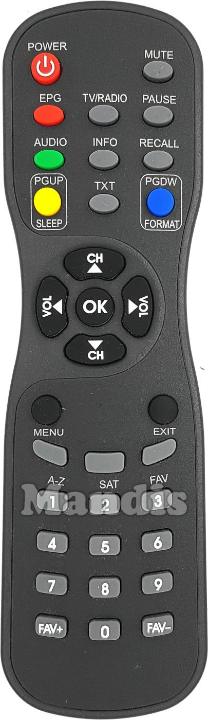 Power, Mute, Red / EPG, TV/Radio, Pause, Green / Audio, Info, Recall, Yellow / PGUP / Sleep, TXT, Blue / PGDW / Format, Up / CH+, Left / Vol+, OK, Right / Vol+, Down / CH-, Menu, Exit, A-Z, Sat, Fav, 1, 2, 3, 4, 5, 6, 7, 8, 9, 0, Fav+, Fav-