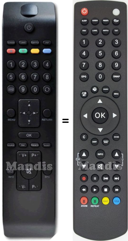 Power, Sleep, Screen, Presets, ↔, FAV, Lang, Subtitle, TXT, 1, 2, 3, 4, 5, 6, 7, 8, 9, 0, EPG, Swap, Photo/Music/Movie, World, Source, Menu, OK, Up, Down, Right, Left, C, Disp., Search Mode, Return, CH+, CH-, Vol+, Vol-, Info, Mute, Rec, Pause, I<<, >>I, <<, Play, Stop, >>, Red/↑/Zoom, Green/↓/Repeat, Yellow/Root, Blue/Title